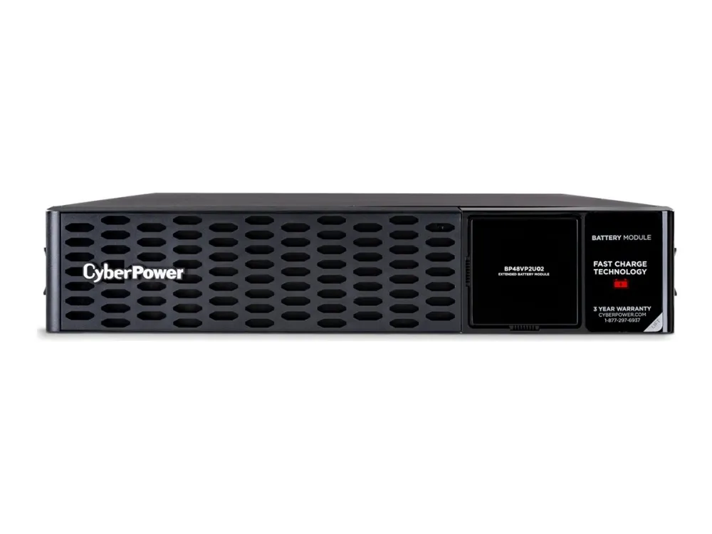 The CyberPower BP48VP2U02 is a rack/tower convertible Extended Battery Module (EBM) that extends battery runtimes during power outages and is designed for the following Smart App Sinewave UPS systems: PR1500LCDRTXL2U, PR1500LCDRTXL2UA, PR1500RTXL2U, PR2000RTXL2U, PR2200LCDRTXL2U, PR2200RTXL2U, PR3000LCDRTXL2U, PR3000RTXL2U, OR1500LCDRTXL2U, and OR2200LCDRTXL2U. This EBM takes 2U of rack space and can be installed in either a rack or tower configuration to match the UPS form factor. Battery equalization technology improves battery life, and toolless battery panel access makes battery replacement fast and simple.