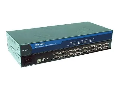 Instant Plug & Play\nThe UPort™ 1650-16 USB-to-serial converters allow you to connect 16 RS-232/422/485 devices to your laptop or workstation through the USB (Universal Serial Bus) port. The UPort™ 1650-16 converters are compatible with new and legacy serial devices, and are perfect for mobile, instrumentation, and point-of-sale applications.\n\nSimplified, Hassle-free Serial Port Expansion\nUSB plug & play makes serial port expansion easy, and does not require IRQ, DMA, or I/O address resources. Users no longer need to open the chassis or power down the system to add COM ports,saving on setup time and cost.\n\nTop Serial Performance\nMoxa's 20-plus years of experience in serial board design is now built into a new top performance CPU called MOXA ART. This chip equips the UPort™ 1650-16 converters with USB 2.0 (Hi-Speed 480 Mbps), a 128-byte FIFO, on-chip hardware and software flow control, and burst data mode, making Moxa’s UPort™ converters perform far better than the competition.\n\n- Hi-Dpeed USB 2.0 for up to 480 Mbps USB transmission.\n- 921.6 Kbps maximum baudrate for super fast data transmission.\n- 128-byte FIFO and on-chip H/W, S/W flow control.\n- Standard 19-inch rack-mountable.\n- Built-in 15 KV ESD protection on all serial ports.\n- IP30-rated, rugged metal housing.\n- COM port assignments maintained across different PCs.\n- Mini DB9 female to terminal block adaptor for easy wiring.\n- Drivers provided for Windows (including Vista) and WinCE 5.0.\n- Locking power cord.