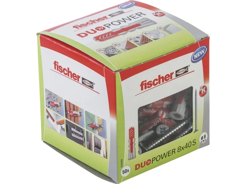 DUOPOWER 8 x40 S LD Fischer DUOPOWER giver meget god holdbarhed med 2 komponenter: den grå komponent af højkvalitetspolyamid aktiverer alt afhængigt af byggemateriale det optimale funktionsprincip (sprede, klapper, knob) den bedste pasform. Den expansion vinger den røde komponent understøtter sikker Dyvelgeometrien muliggør fastgørelse og giver ekstra sikkerhed til det grå komponent. Enkel isætning af skruen og rigtigt træk til sidst. Ingen ved at dreje bolten. Den på rawlplug-hoved formede kant forhindrer, at pluggen i borehullet glider. De medfølgende bolte er optimalt afstemt til udvidelses-rawlpluggen duopower.