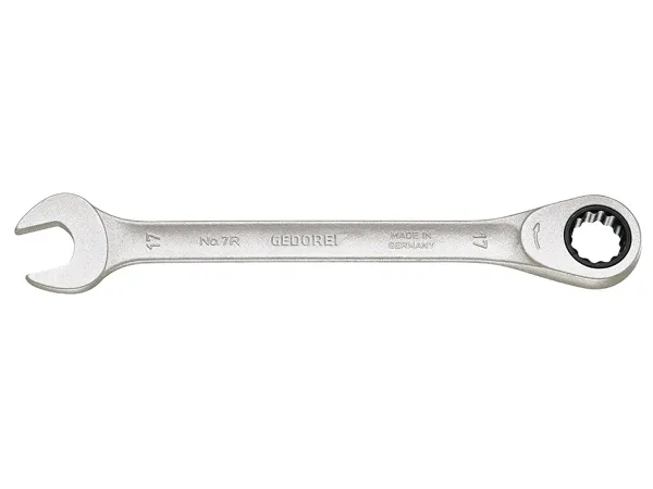 With same size each end. Flat pattern. UD profile. Working angle: 7° from 8 to 15 mm, 6° from 16 to 27 mm and 5° from 30 to 36 mm. For ratchet loosening and fast tightening. High torque transfer. Hollow profile comfortable to hold. Warp-resistant geometry with double T-girder effect. Gedore vanadium steel 31CrV3. Non-glare look thanks to matt chrome-plating, locking insert and pawl manganese-phosphated. Hot forged. Jaw exactly ground to spanner size. Tried-and-tested Gedore technology combined anew: spanner jaws of classic no. 6, stable hollow shaft of no. 7 and refined mechanism of the U-20 ratchets. In combination with adaptor 7 RA or 7 RB (please order separately) the spanner 7 R can be used as a (bit) ratchet. European Patent applied.