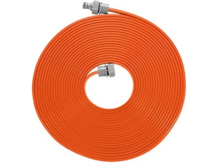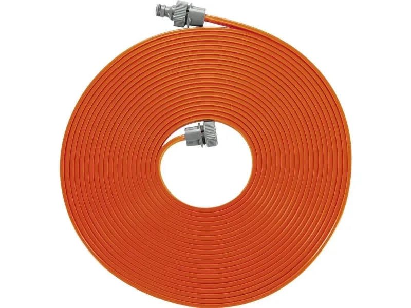 Slange-sprinkler, orange, komplet med armaturer, længde 15 m GARDENA's slange-sprinkler tilbyder et optimalt og fint spray til bed, rabatter og smalle zoner. Den er allerede udstyret med alle nødvendige GARDENA-systemdele, så det kun er vandkilden, som skal tilsluttes. Den orange slange-sprinkler har en fast længde på 15 m, men den kan forlænges med en enkel sammenkobling op til maksimalt 22,5 m. Derudover kan slange-sprinkleren også forkortets individuelt - du skal blot skære af i den ønskede længde og montere tilslutningsdelene. Du kan også få slange-sprinkleren i lige den længde, som du har brug for, da den også kan fås som metervare. Denne slange-sprinkler har 10 års slangegaranti. Til enkel vanding af mindre flader. Ideel til bede, rabatter og smalle zoner Skåner planterne Gartenredskab med systematisk karakter Fås i forskellige farver