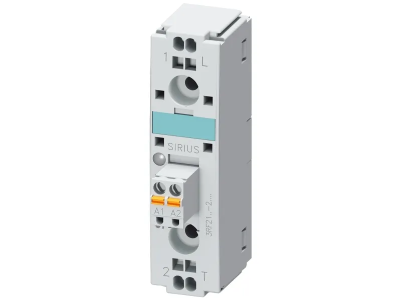 1-faset halvlederrelæ 3RF21 Semiconductor relay, 1-phase 3RF2 Overall width 22.5 mm, 50 A 48-460 V / 24 V DC Spring-type terminal solid-state relay SIRIUS 3RF21 for switching resistive/inductive loads, e.g. of heaters or valves in a bottling plant. The devices are non-wearing and silent and are therefore ideal for noise-sensitive areas (offices, hospitals). They are also extremely reliable at high switching frequencies. The compact design saves space on the cooling surface. The solid-state relays can also be expanded for a wide range of applications by simply clicking on the standardized 3RF29 function modules. The devices are approved for worldwide use (e.g. IEC and UL/CSA). The solid-state relays are available as single-phase devices in two widths, or as three-phase devices. They are available for different power ratings and rated operating voltages. Designed for AC or DC operation, they are available with screw, spring-type or ring terminal lug connections. In addition to the 3RF29 function modules, control connectors and terminal covers are also available as accessories. Simple, efficient and always up to date - SIRIUS modular system.