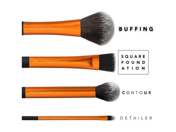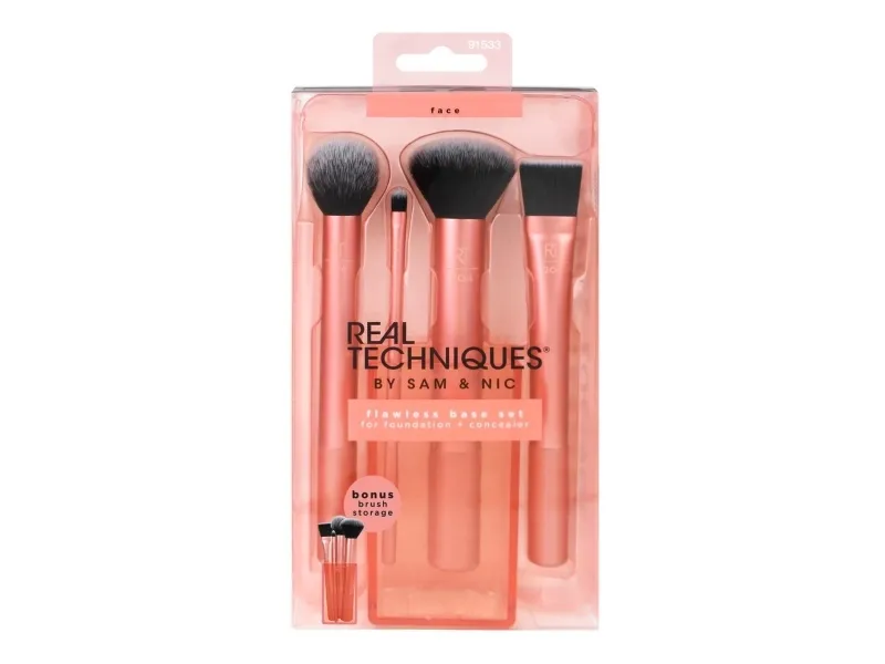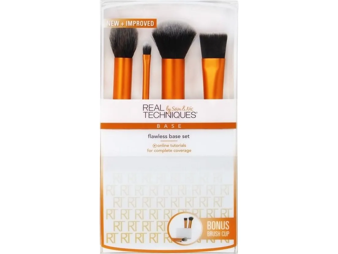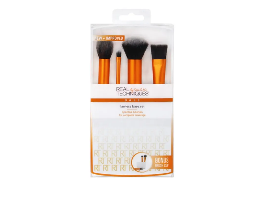 Create a perfect canvas with our flawless base set.\n\nIncludes:\n Contour brush\n For delicate application of highlighter or contour product above or below cheekbones\n Detailer brush\n Precision cut to effortlessly conceal problem areas\n Tip: use with lipstick for long-lasting shape and definition\n Buffing brush\n Ideal for full coverage application of loose or compact powder foundation\n Square foundation brush\n Densely packed + unique cut to build custom coverage with liquid foundation\n Brush cup\n Keeps brushes organized on your counter\n\n100% Cruelty-free\n\nHow to Clean:\nClean weekly with our brush cleansing gel for improved brush performance
