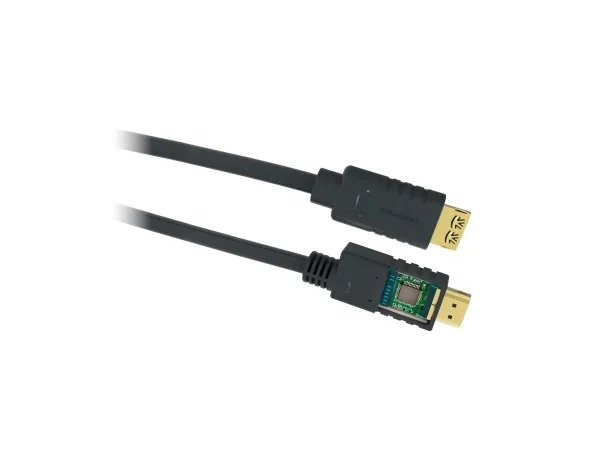 CA-HM active HDMI copper cable provides a perfect cable solution for delivering HDMI signals over long distances: 18Gbps up to 20m (66ft) and 10.2 Gbps up to 30m (98ft). The innovative technology utilized in the cable’s connector features superior equalizing and signal compensation to meet the most demanding challenges in Pro AV installations. This unique solution simplifies long distance installations by using a true plug & play cable that draws power from the HDMI source. There is no need for an external power source. CA-HM features the Kramer exclusive K-Lock HDMI connector, that prevents cables in your installation from unintentionally disconnecting, eliminating cable-related service calls. Additionally, an LED on the connector indicates when the signal is transmitted successfully.