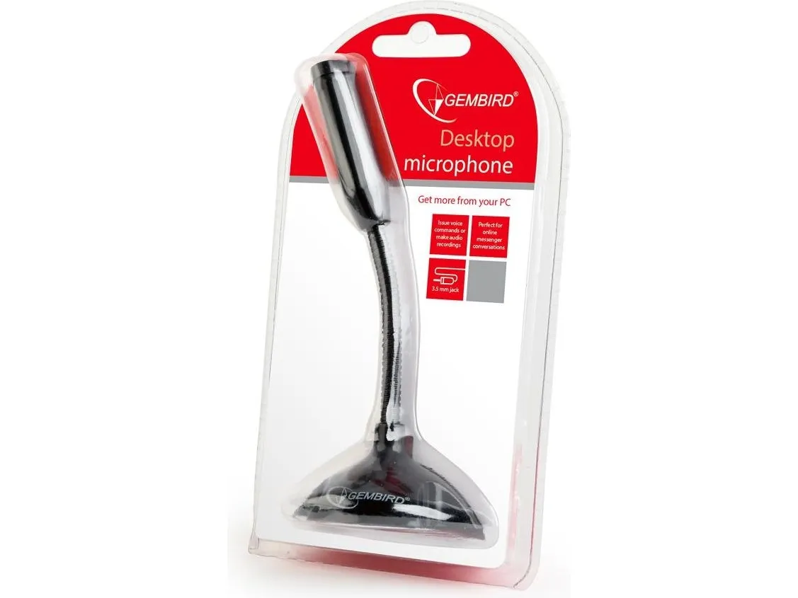 Gembird *Desktop microphone black. Type: PC microphone, Microphone sensitivity: -62 dB, Microphone frequency: 100 - 16000 Hz. Connectivity technology: Wired, Device interface: 3.5 mm (1/8"). Product colour: Black, Cable length: 1.1 m. Microphone weight: 88 g. Package width: 100 mm, Package depth: 175 mm, Package height: 175 mm