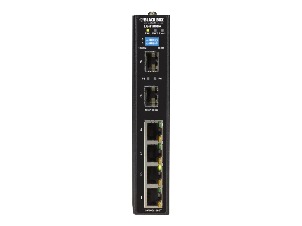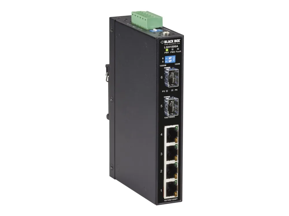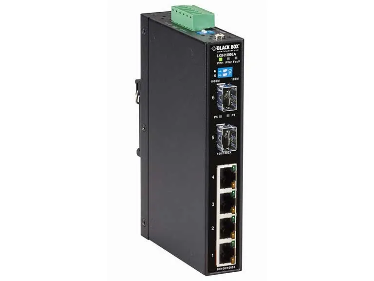 Reliable and scalable. The very reliable LGH1000 Industrial Ethernet Switch, (4) 10/100/1000-Mbps, (2) GE SFP, is designed for the far edges of your network. Use it in cold, dirty, indoor environments with temperature extremes of -40° to +70°C, such as loading docks or monitoring stations. This rugged switch comes in an IP31-rated enclosure that can be DIN-rail or wall mounted.
