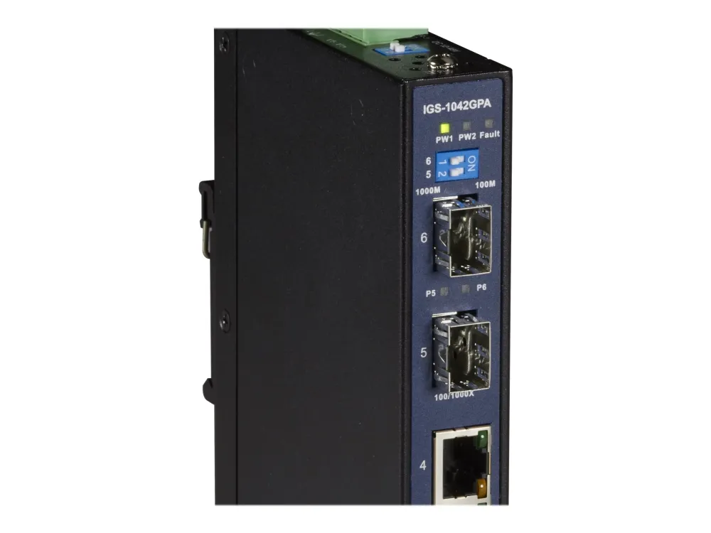 - Provides four 10/100/1000 Mbps RJ-45 ports and two 100/1000Base-X SFP slots. - Use in harsh applications, including factories, oil/gas fields, military vehicles/ships, HVAC controls, security and surveillance, and more. - Built-in smart alarm warns of power failures. - LEDs indicate power, alarm, speed, and link/activity. - DIN rail or wall mount.