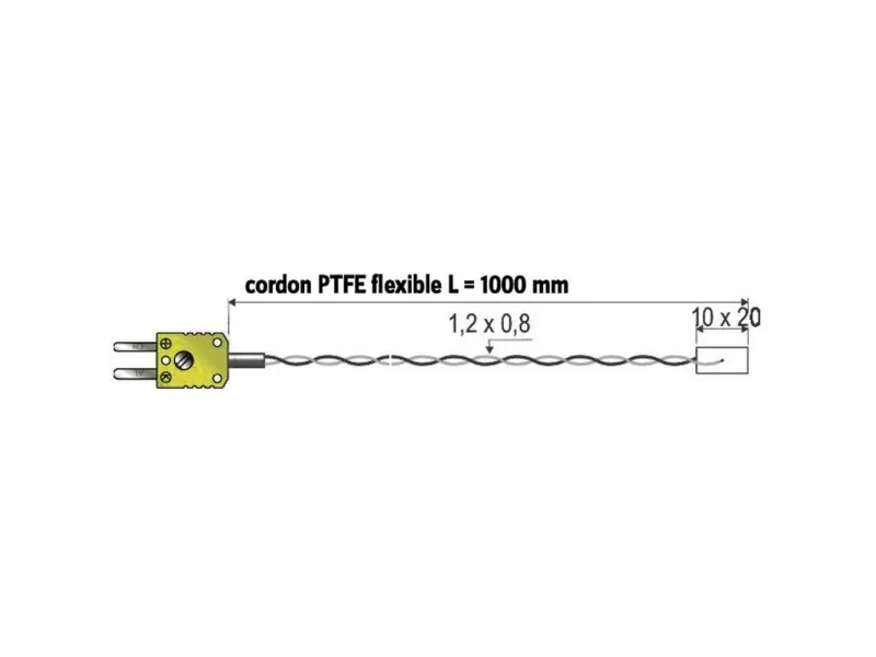 Type K-trådtermoføler PTFE-isoleret Folieføler 10 x 20 mm, selvklæbende med 1 m termotråd. Enkeltledere PTFE-isoleret (forseglet). K-type (NiCr-Ni) -50 til +200 ºC Miniature-termoelement-kontakt