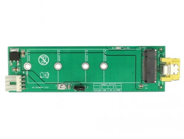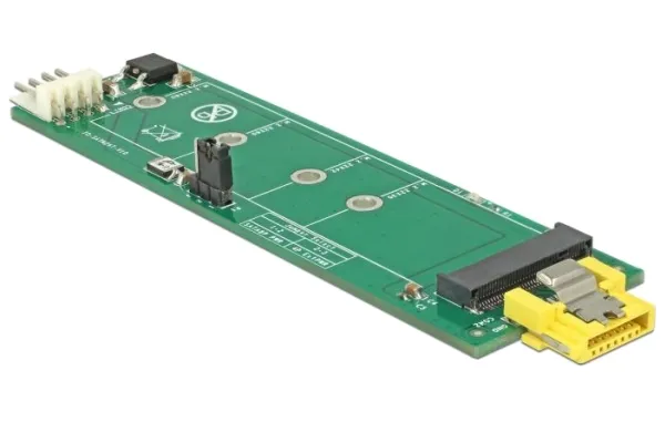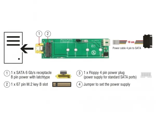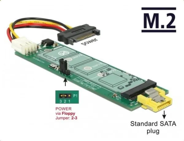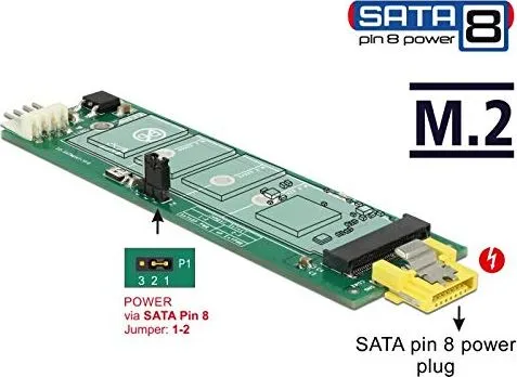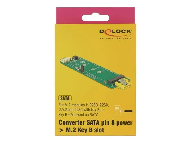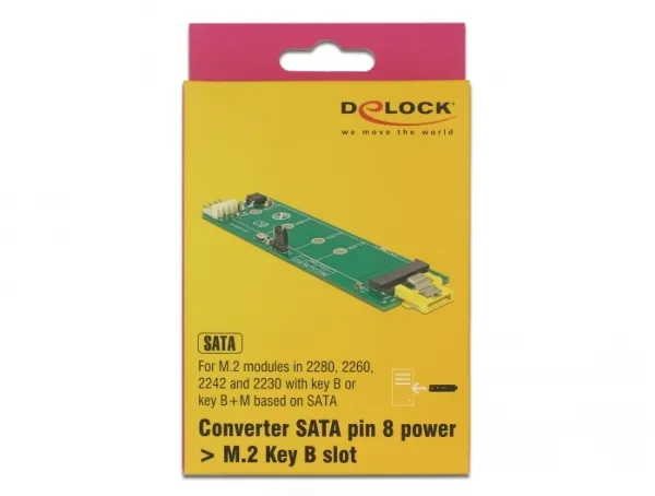 This converter by Delock enables the connection of a M.2 SSD in 2280, 2260, 2242 and 2230 format. The converter can be connected to a SATA pin 8 power plug and does not need an additional power supply. Additionally, the converter can be connected to a standard SATA port, then a power supply to the 4 pin power connector is needed.