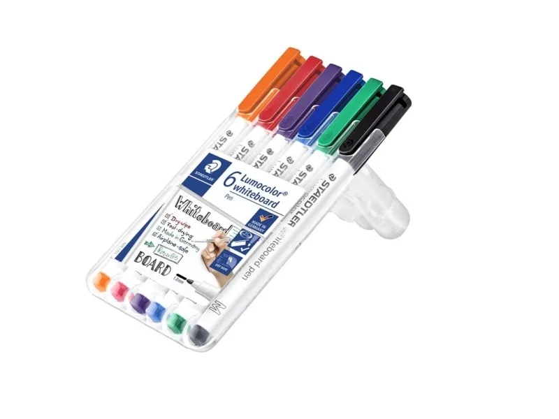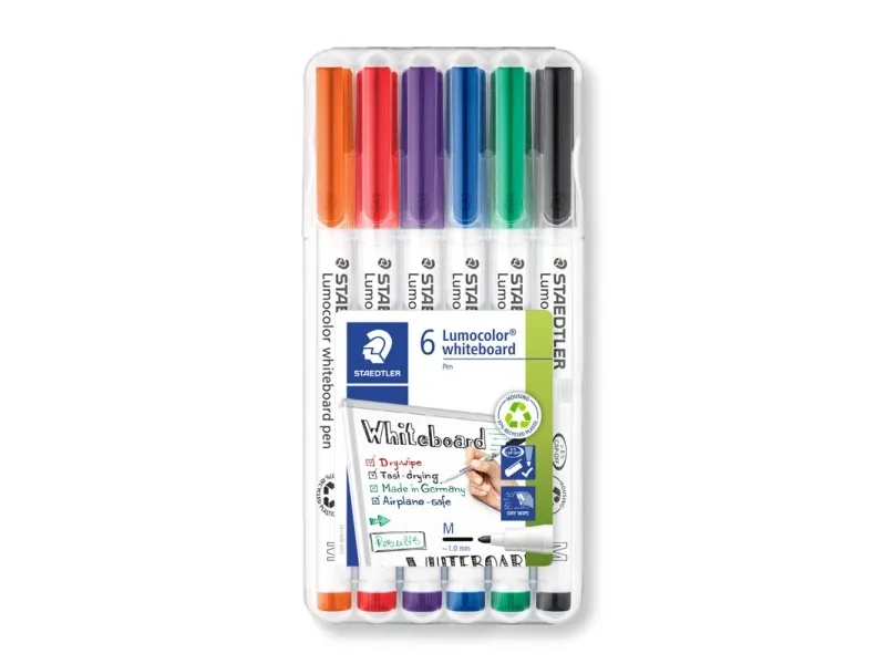 Whiteboardpen. Ideel til mindre whiteboardtavler på kontoret, i skolen og i hjemmet, og til Lumocolor memo bord. Kan ligge uden hætte i 8 timer uden at tørre ind. Kan aftørres uden rester på whiteboards samt glatte overflader som glas og porcelæn. Hurtigtørrende, lugtsvag. Stand-up Staedtler Box. PP skaft og hætte garanterer lang levetid. Flysikker - automatisk trykudligning forhindrer pennen i at blive utæt på flyet. Xylen- og toluen fri blæk. Sæt med 6 assorterede farver.
