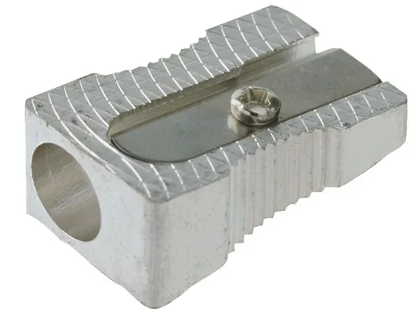 Blyantspidser m/enkelt hul. Børstet aluminium med skruet blad. Passer til de fleste blyanter.