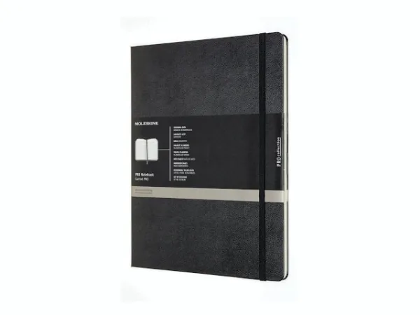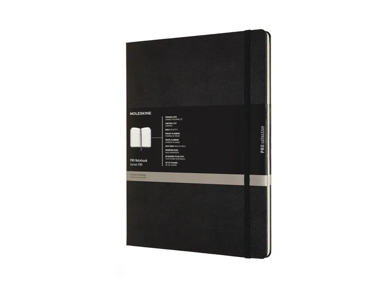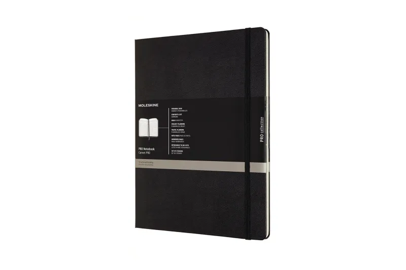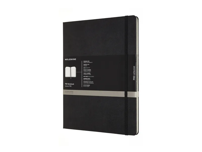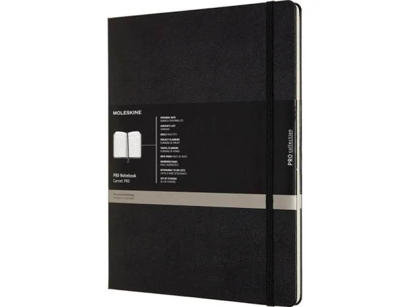 Den klassiske sorte PRO-notesbog fra Moleskine er alsidig og praktisk designet med m�let at optimere din arbejdsdag.�Sort�Hard cover�Linjerede sider�21.59x27.94 cm.�De sidste 8 sider er perforerede�Bogm�rke�Elastisk lukning�Inderlomme til l�se notater�70-grams elfenbensfarvet papir�FSC-certificeret
