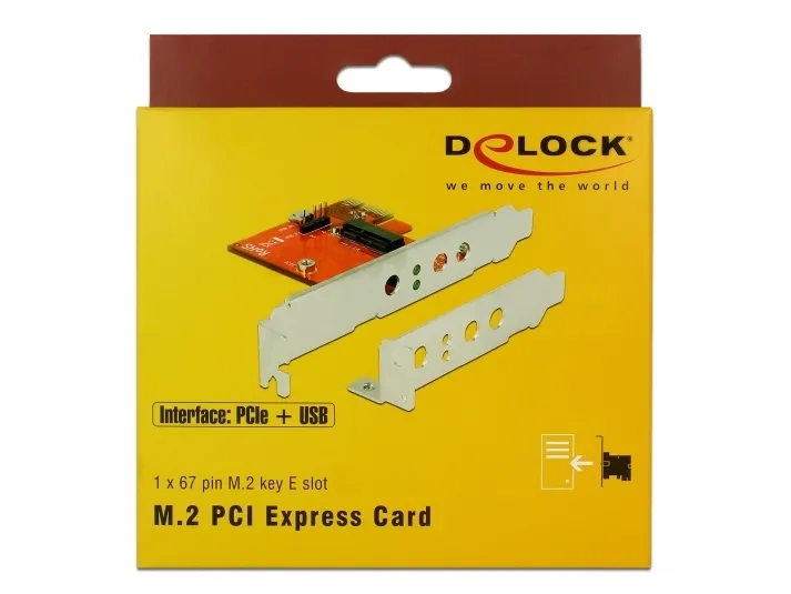 This PCI Express card by Delock expands the PC by one M.2 key E slot. Different M.2 modules with USB and PCIe signals can be inserted in the card. On the M.2 key A or key E interface can be used e.g. WLAN, Bluetooth, GNSS, 3G, HSPA and NFC modules. Further it is possible to use both functions of a module which has e.g. WLAN and Bluetooth. The USB modules need to be connected via the USB interface of the card to the system.