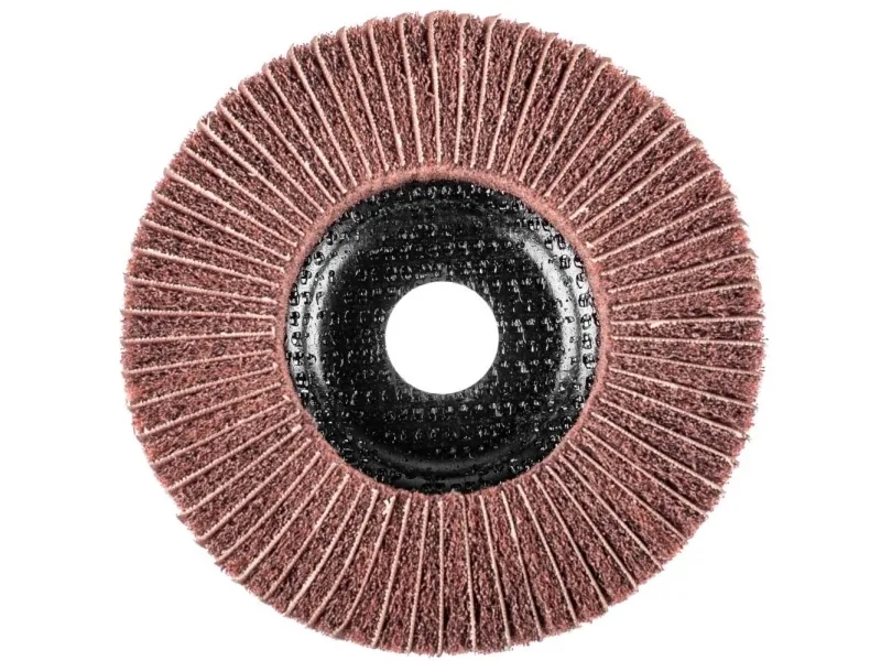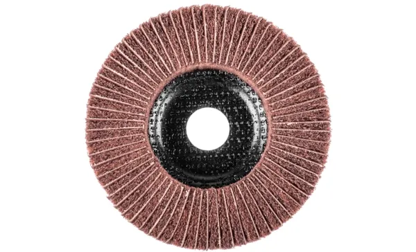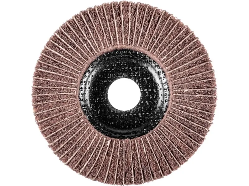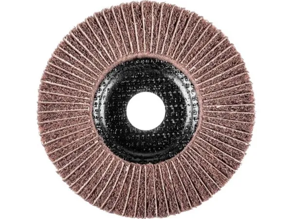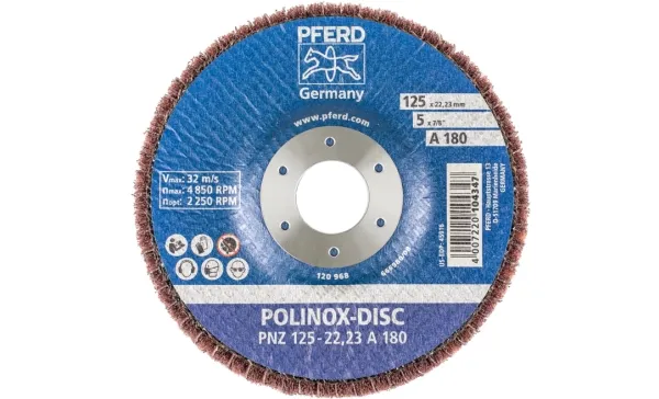 Polinox fleece-slibedisk PNZ dia. 125 mm boring-dia. 22,23 mm A 180 for finslibning og finish Slibeskind- og slibevævellerne er klæbet på en glasvævsplade, hvorved disken kan anvendes på store overflader i fronten. På grund af de tæt emballerede lameller opnås en lang levetid. Værktøjet er udviklet til bearbejdning af store flader på vinkelslibere med roterende omdrejningstal.