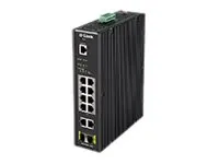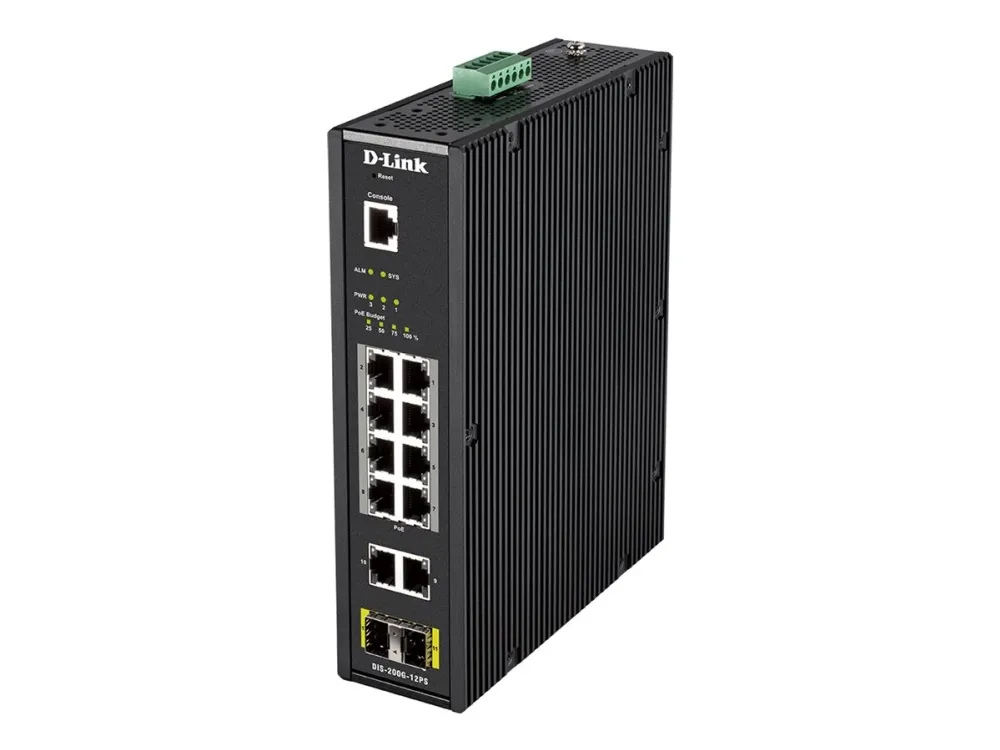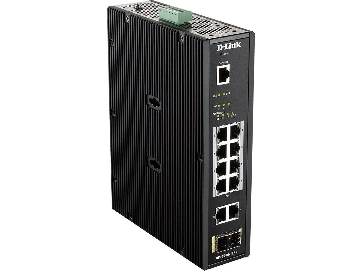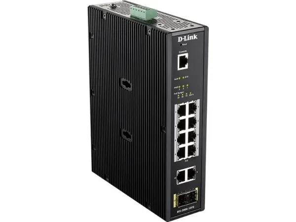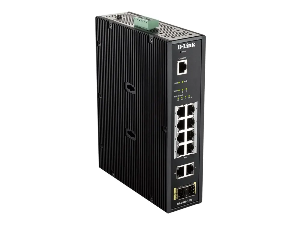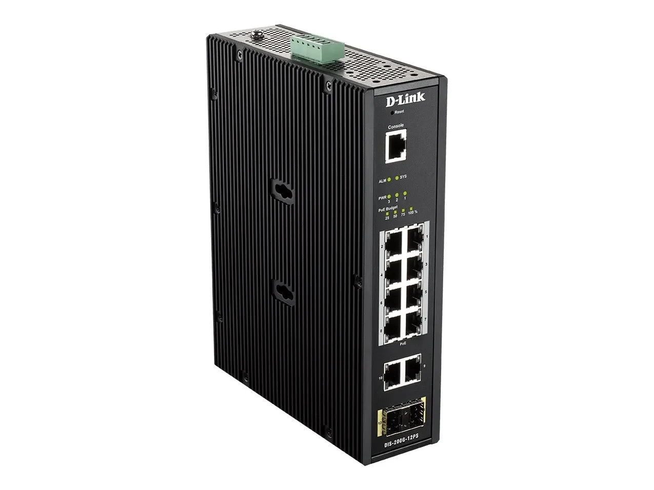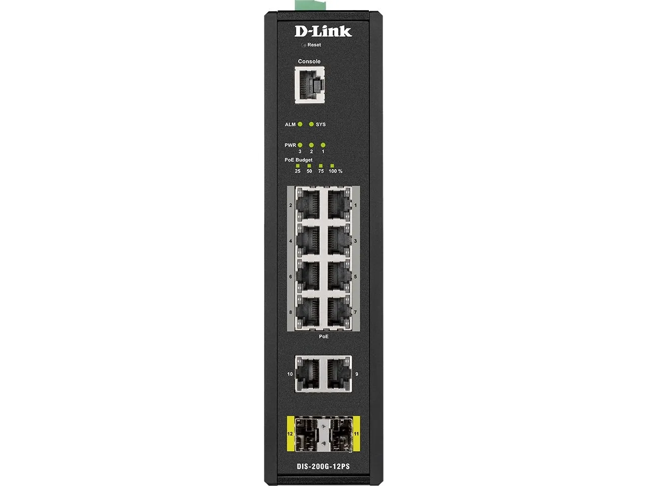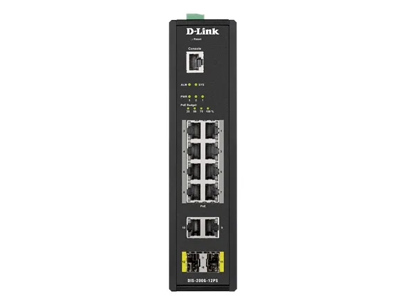 The DIS-200G-12PS Layer 2 Industrial Managed Switch is equipped with 8 PoE-capable 10/100/1000BASE-T ports, 2 10/100/1000BASE-T ports, and 2 SFP ports. This switch features a robust design making it ideal for deployment in industrial and outdoor surveillance settings, capable of withstanding the harshest environments. The DIS-200G-12PS furthermore integrates advanced management and security functions to provide a complete solution.