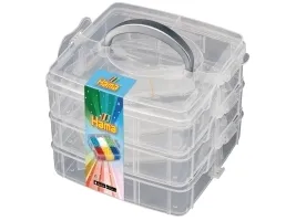 En opbevaringsbox med 3 bakker. Der er skillevægge nok til at kunne inddele hvert af de 3 bakker til 6 rum (plads til 18 farver).