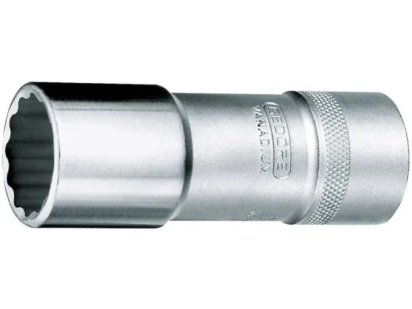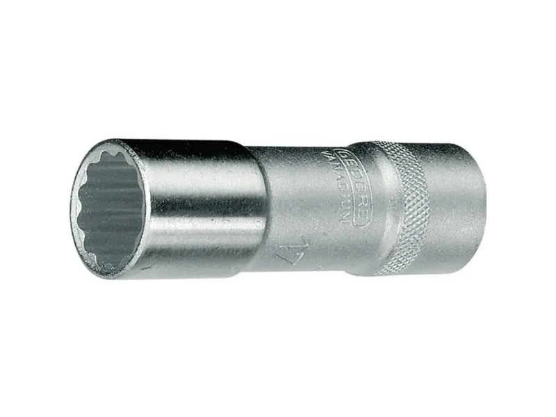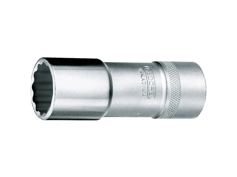 Acc. to DIN 3124, ISO 2725-1. Square drive as per DIN 3120 - C 12.5, ISO 1174, with ball retaining groove. Hand-operated, knurled grip. Gedore vanadium steel 31CrV3, polished, chrome-plated. Sizes 16, 18, 21 mm with hole drilled for tommy bar Ø 8 mm.