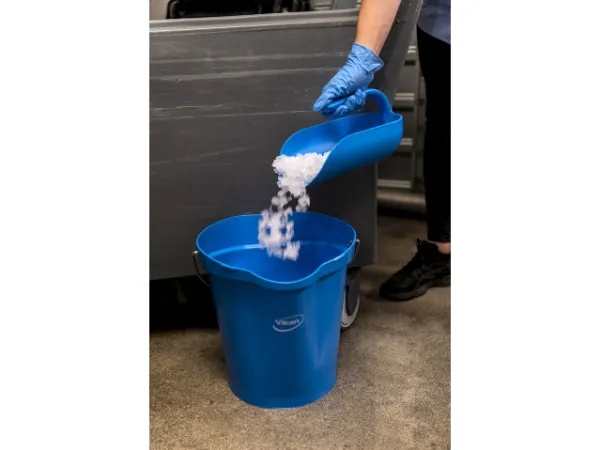 Denne prisbelønnede spand er ideel til transport af rengøringskemikalier og både varme og kolde ingredienser. Den har en drypfri hældetud og en hævet bund med et håndtag i rustfrit stål. Den har også en indvendig måleskala med forskellige måleenheder. Den flade side forhindrer spild, og spanden har et tilhørende vægophæng (16200) til praktisk opbevaring.
