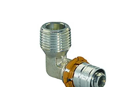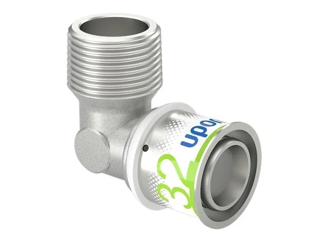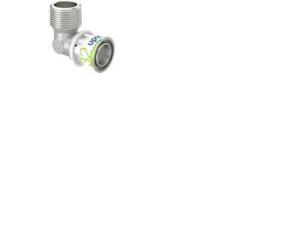 Preskobling af forkromet messing til brugsvand- og radiatorsystemer med preskappe af rustfri stål / aluminium, stop ring, pres-identifikation, farvekode, ''garanteret utæt hvis ikke presset''. Kalibreringsfri. Cylindrisk udvendigt gevind iht. EN 10226-1 til pakning. Må kun anvendes med Uponor MLC-rør og med Uponor godkendt presværktøj.