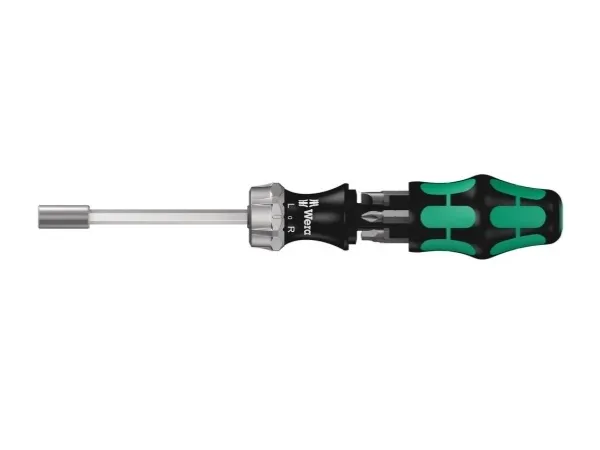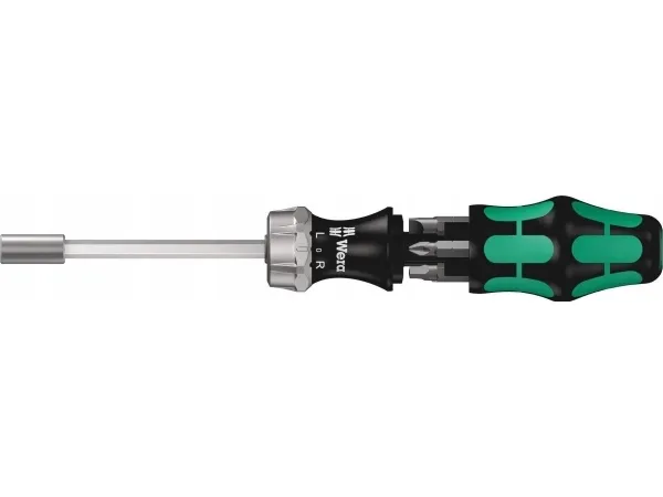 Kraftform Kompakt 27 RA 2 SB, 6-dele Wera kompaktværktøj med flerkomponents kraftgreb til høje arbejdshastigheder og særlig ergonomisk skruning. Integreret bit-magasin i håndtaget. Inkl. skralde: Fin fortanding, der giver lavere tilbagerulning, omskifterring (højre, fast, venstre), maksimalt drejningsmoment på op til 50 newtonmeter; sekskantklinge med 1/4 indvendig sekskantholder, rustfri stålbelægning, kraftig permanentmagnet.