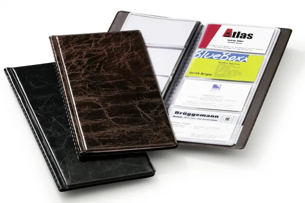 | • Visitkortmappe med overflade i læderlook • Med indsvejsede lommer • Til 96 visitkort i størrelsen 90 x 57 mm |