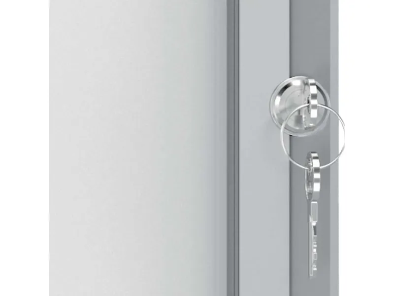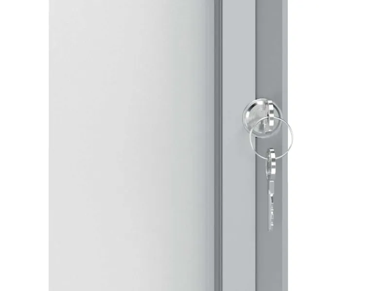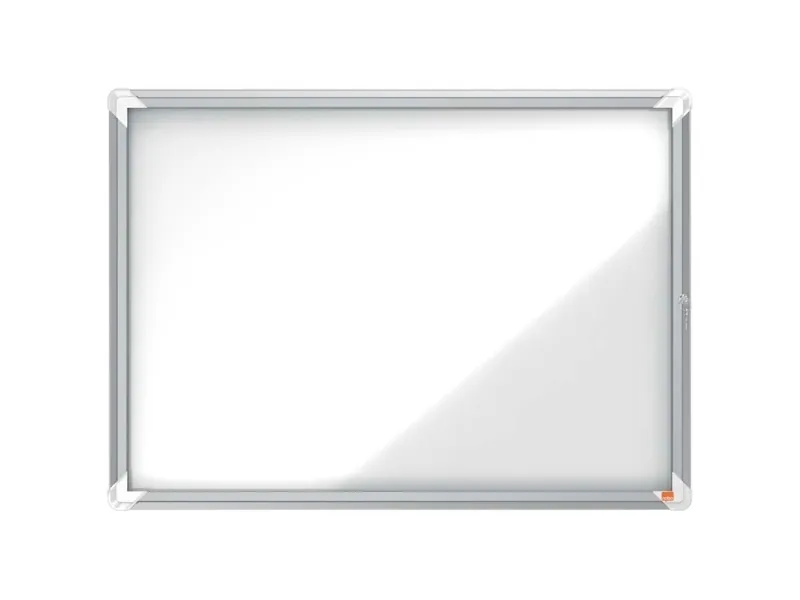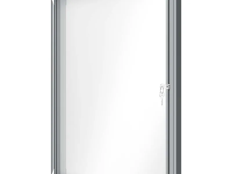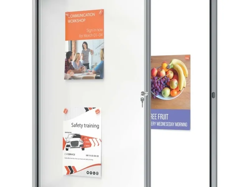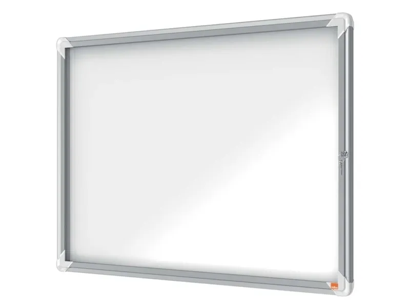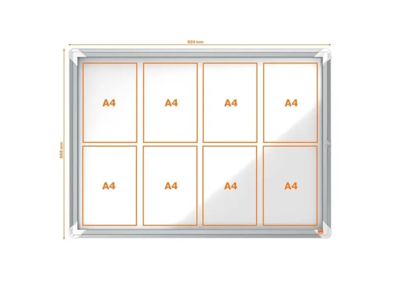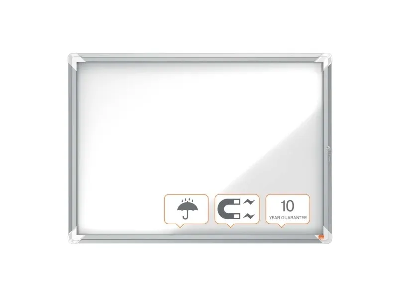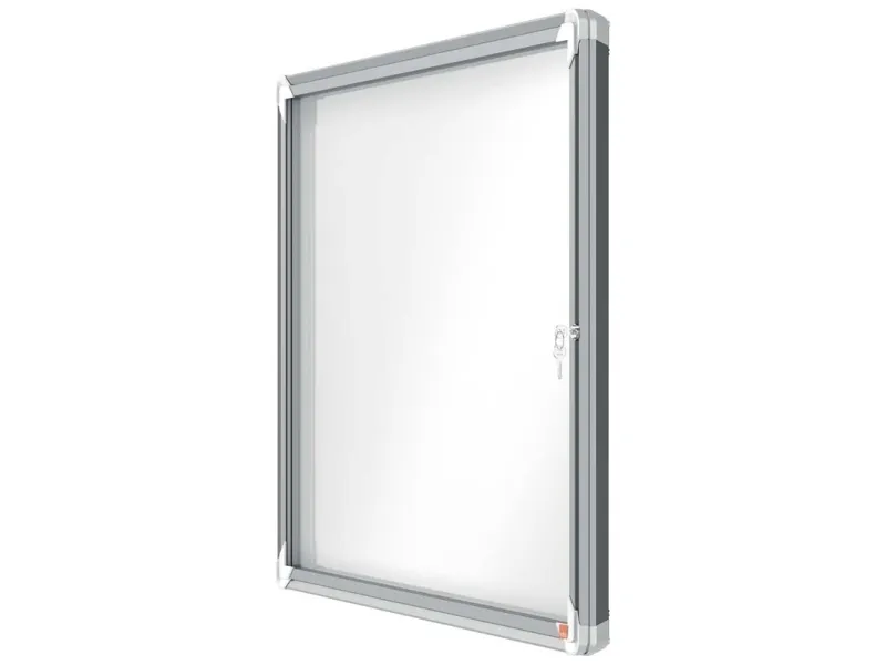 The Nobo lockable, wall-mounted, magnetic dry-wipe case is the practical yet stylish solution for creating eye-catching displays and messages for customers and the public, whilst keeping your information in pristine condition and free from tampering.\n\nDesigned for outdoor use, it features a contemporary aluminium frame, magnetic whiteboard lining, hinged glazed door and weatherproof silicon seals to protect your documents. You can secure printed sheets to the board with magnets or write messages using dry-wipe pens. With dimensions of 732mm (H) x 1012mm (W), it can accommodate up to 8 x A4 posters.\n\nSecure: your important information will remain safe and intact thanks to the lockable door with top quality barrel lock, supplied with 2 identical keys; while the 4mm toughened glass in the door ensures optimum safety and security.\n\nWeatherproof: the strong aluminium frame is powder coated for extra durability and corrosion resistance. Silicone seals between the back panel and main frame and around the door ensure your information is protected from wind, rain and condensation.\n\nFlexible: The door opens out 100°for quick and easy access to the contents, ideal for places where key information is updated regularly and quickly. Write up the daily restaurant menu, post up emergency procedures outside a public building or use it to attract customers with special offers as they pass.\n\nProfessional: with its high quality, smooth magnetic surface, the Nobo glazed whiteboard cleans easily when used with dry-wipe pens. It is stain resistant and leaves no ghost images, ensuring you communicate a clear, professional message every time.\n\nSimple: the case is supplied pre-assembled and ready to install, complete with instructions, invisible wall bracket and fixings. The 3 year manufacturer’s warranty means you can purchase with total confidence.\n\nOnce installed, it takes just seconds to secure your notices and memos in place to create a tidy, eye-catching display.