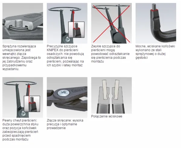 meget belastbar ved konstant brug: op til 10 gange så lang standtid som let drejede spidser. Med indsatte spidser for sikkert arbejde. med beskyttelse mod overudspiling. Store holdeflader på spidserne: ingen vridning af ringene, let montage. Skruet led: tangen går præcist og uden spillerum. åbningsfjeder ligger i leddet, beskyttet og kan ikke gå tabt. Skridsikkert kunststof på grebene. Slankt tanghoved for optimal adgang til arbejdsemnet. DIN 5254 A; lige spidser.