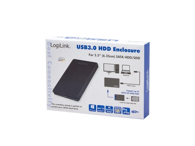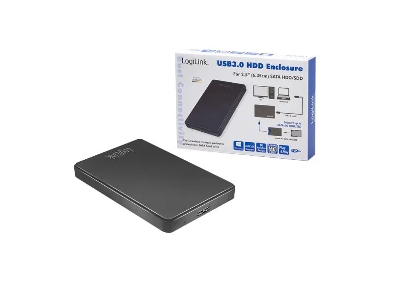 LogiLink UA0339. Product type: HDD/SSD enclosure. Number of storage drives supported: 1, Storage drive size: 2.5", Supported storage drive interfaces: Serial ATA, Serial ATA II, Serial ATA III. Data transfer rate: 5 Gbit/s. Product colour: Black. USB connector type: Micro-USB B