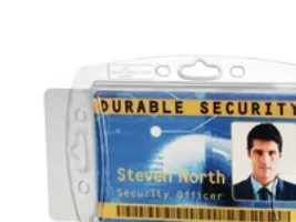 ID-kortholder, Durable. Holder af slidstærkt akryl, som er klart så indholdet nemt kan ses og f.eks. stregkoder kan scannes. Med plads til 2 stk. adgangskort, sikkerhedskort, plastikkort eller ID-kort a 5,4 x 8,7 cm. Holder med fingerhul, så du nemt kan udskifte kortet. Huller, så kortholderen kan kombineres med kæde, yoyo-udtræk, klemme eller keyhanger. Kan anvendes både liggende og stående. Best.enhed: pakke a 10 stk.