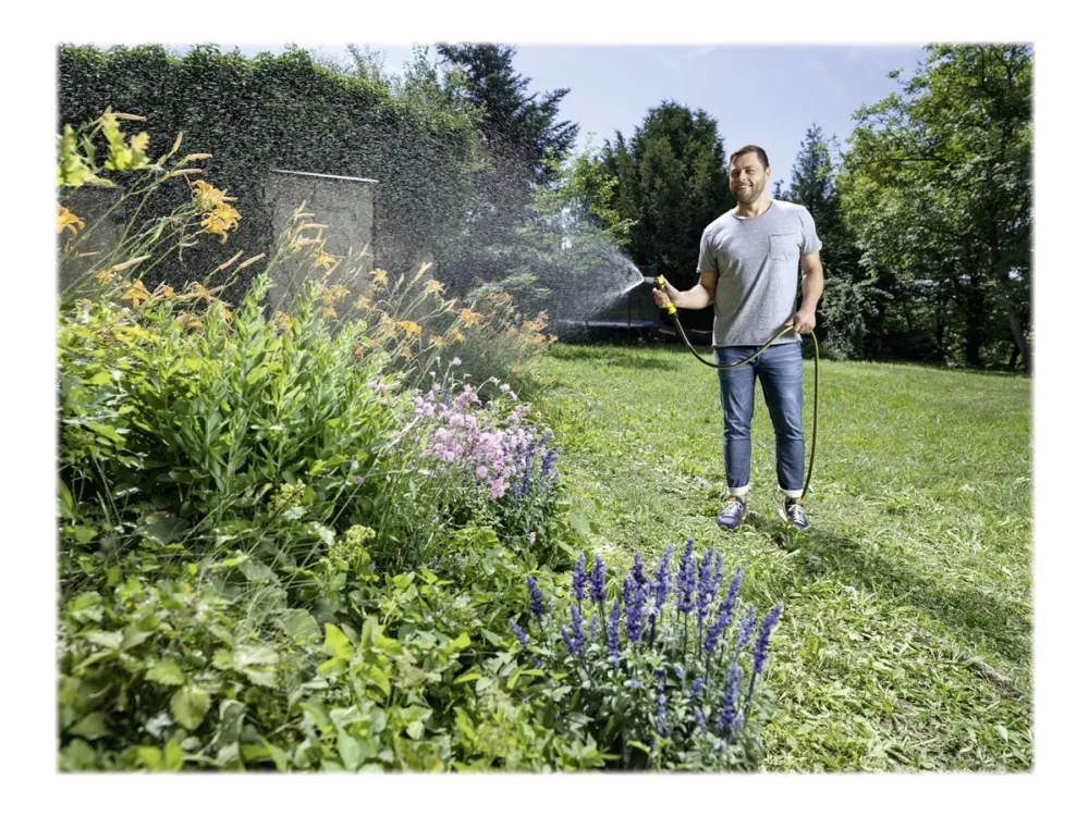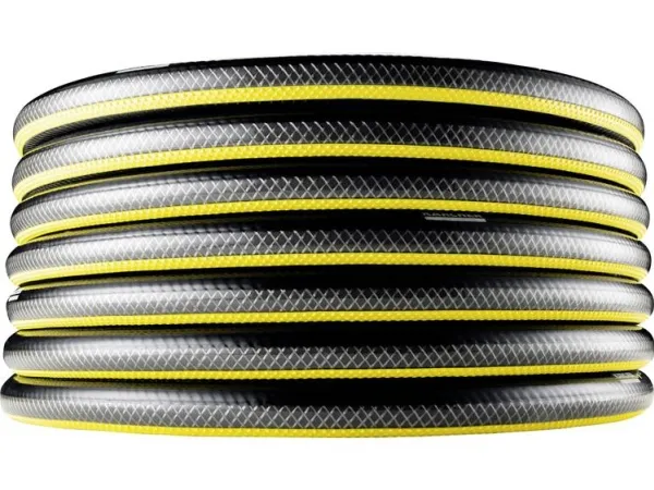 The Performance Plus quality garden hose, which measures 1/2" in diameter and 20 m in length, is perfect for watering small to medium gardens and other spaces. The high-quality multi-layered woven material has an improved feel, sits notably more comfortably in the hand, and makes this innovation from Kärcher particularly robust, flexible and extremely resistant to kinks - ideal qualities for a high-performance watering system providing constant water flow. What's more, the garden hose is free from phthalates (< 0.1%), cadmium, barium and lead - meaning it contains absolutely no substances that are harmful to human health and yet is still durable. The weather-resistant anti-UV outer layer protects the material and the opaque middle layer prevents algae from building up inside the hose. The bursting pressure is 45 bar. The water hose also boasts an impressive temperature resistance of between -20 and +60 °C.
