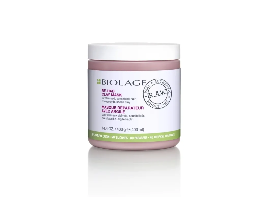 Re-Hab Clay Mask with honeycomb and kaolin clay deeply conditions stressed, sensitized hair to rebuild strength.