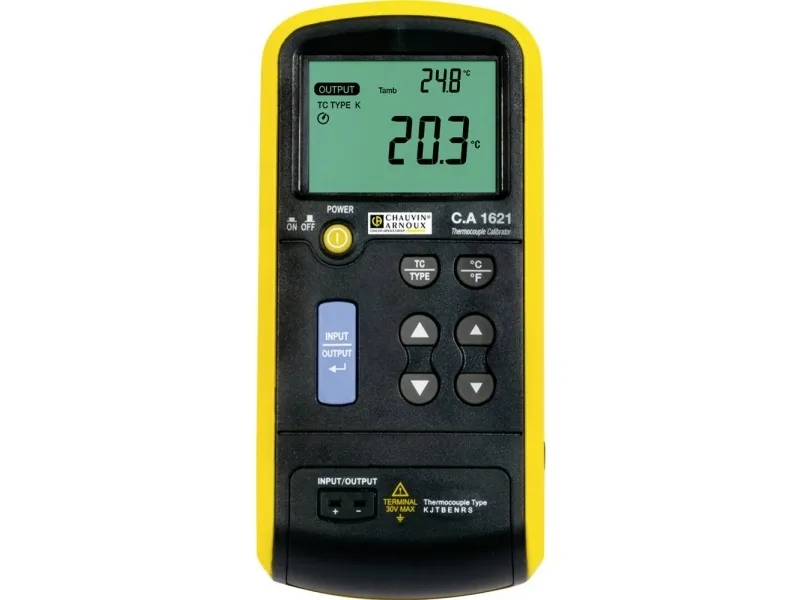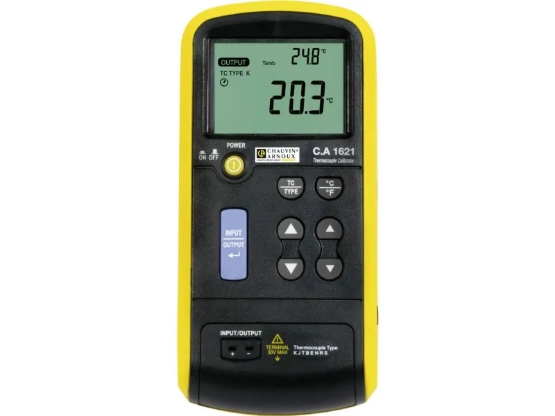 Ca. 1621 kalibrator til termoelementføler Temperatur-kalibratoren til termoelementer er kompakt og nem at anvende. Den kan måle og simuleringer af op til 8 termoelementer-typer (J, K, T, E, R, s, B, N) og spændinger inden for mV-område. Batteridrift giver mulighed for netuafhængig drift på stedet. Via netdrift er et uafbrudt forbrug muligt.