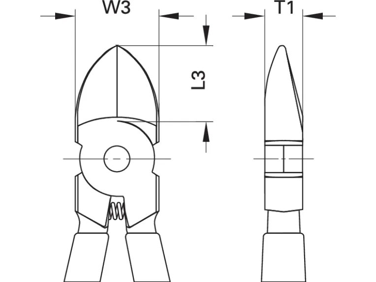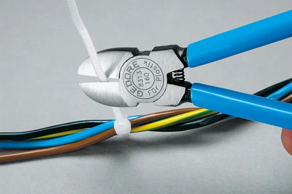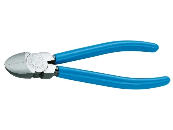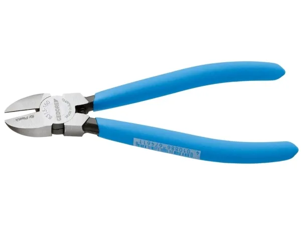 Without cutting edge bevel, for flush cutting of plastic parts or similar soft materials. Black, cutting faces flat-ground, with compression spring for automatic opening. With blue dipped non-slip handles (TL).