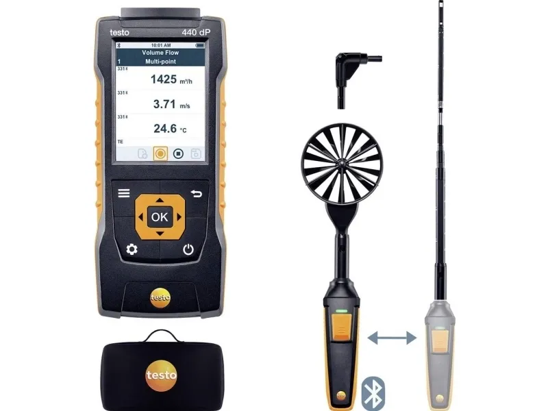 Testo 440 delta P Stromungs-Kombisæt 1 med Bluetooth® Med sættet klarer du alle relevante målinger i ventilation kanalen og ved luft-/loftsudløb! Sættet indeholder en klima-måleapparat testo 440 dP inkl. Differenstryksensor samt de 100 mm-vingemekaniske hoved og hitzdraht-sondenkopf (dia. 9 mm) til påsætning på det medfølgende universelle Bluetooth-håndtag. Til komfortabel målinger kan begge sonder hoveder med den medfølgende teleskop kombineres. Til sættet medfølger et passende kombi-kuffert!