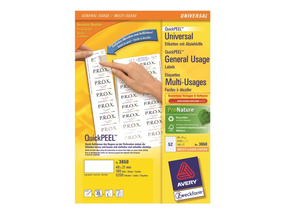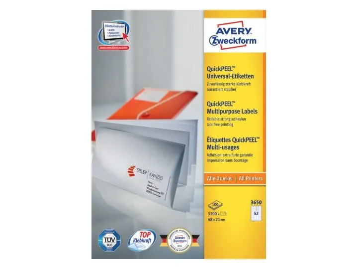 Do you work in a company in which there are many different types of printers and copiers? The universal labels are suitable for all standard printers and copiers. They are also all-purpose labels and can be used for various different applications. This means that whenever you need adhesive labels, you will always have the right labels for your particular purpose to hand. With Avery Zweckform's free-of-charge templates and software solutions, you can also design and print the labels really quickly and easily!