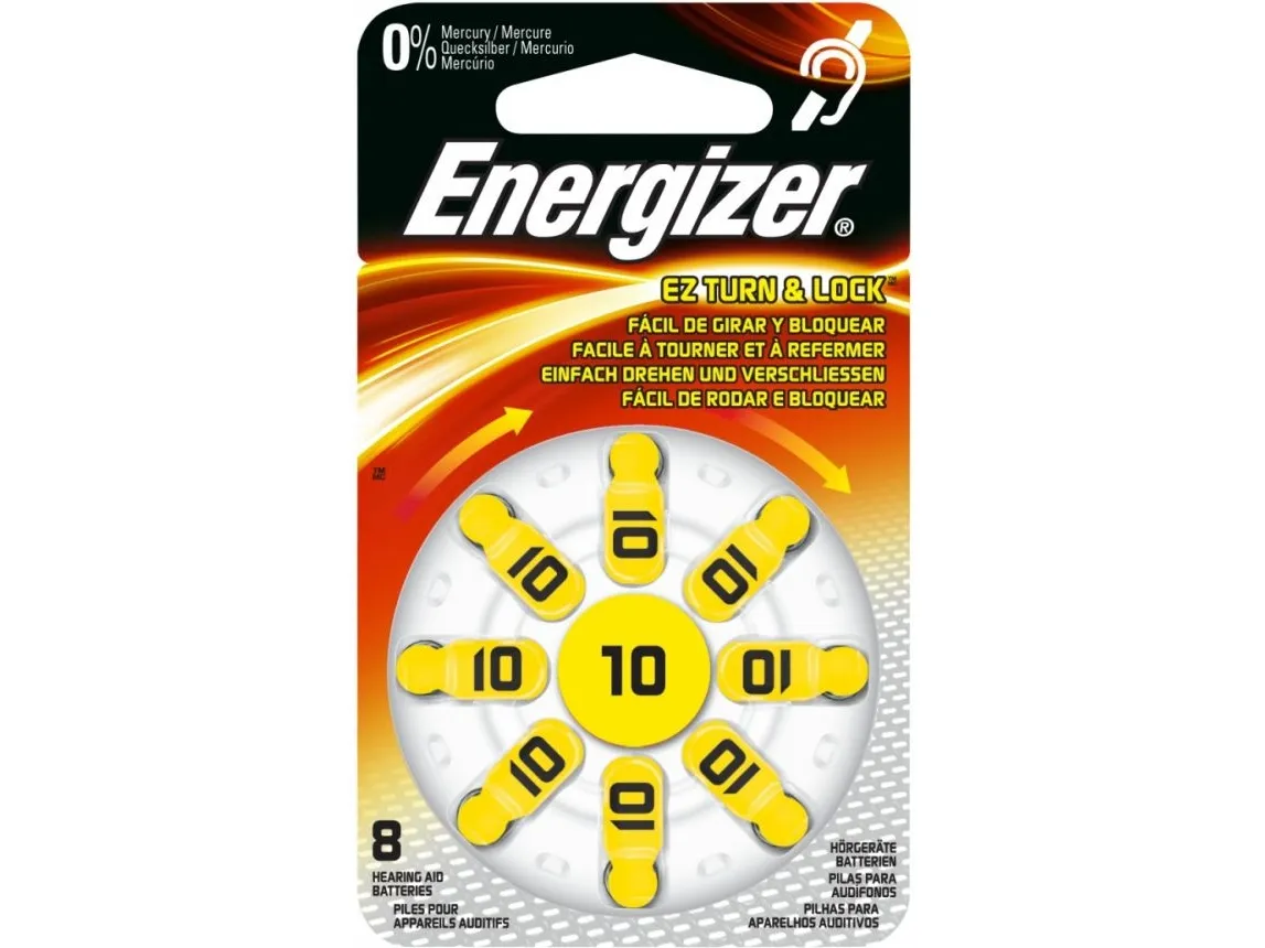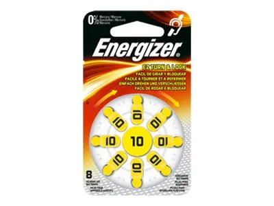 Energizer høreapparatbatterier ZA10, 8 stk. Lange flige til enkel udskiftning af batteri. Batteristørrelsen kan nemt læses på emballagen, og der er en drejemekanisme til enkel og sikker opbevaring eller udtagning af batterier. Pakke med 8 stk. Energizer høreapparatbatterier ZA10, 8 stk.