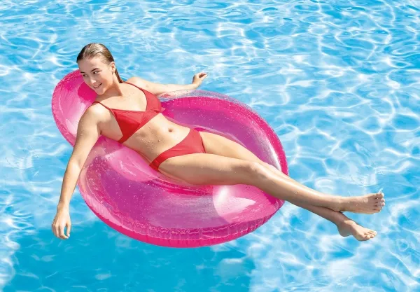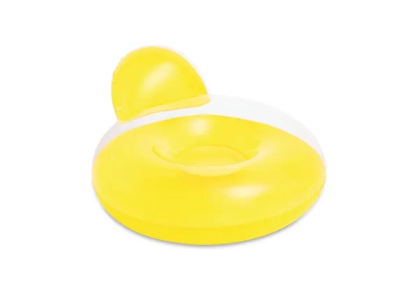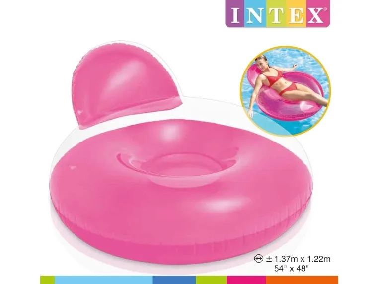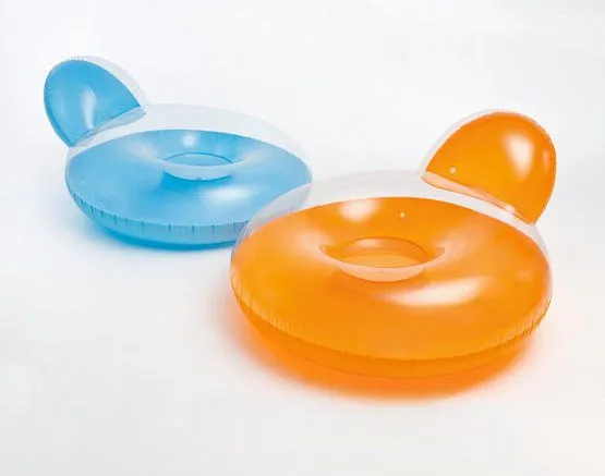 Oppblåsbar stol for stranden eller hagen. Lekker oppblåsbar lenestol med ryggstøtte. Transparent design med sterk orange eller blå bunn. Perfekt til bruk på stranden, i hagen, i bassenget eller innendørs som TV- eller spillstol. (137x122 cm)