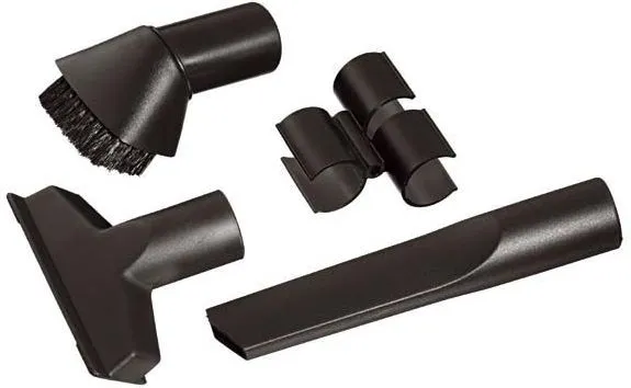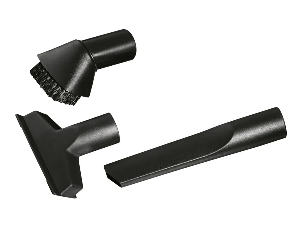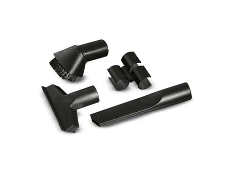 Nozzle kit for all industrial dry vacuum cleaners, includes crevice tool, upholstery tool, round brush and clip holder.