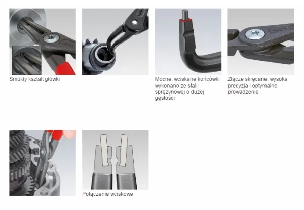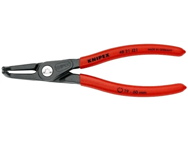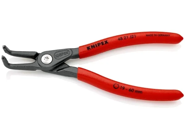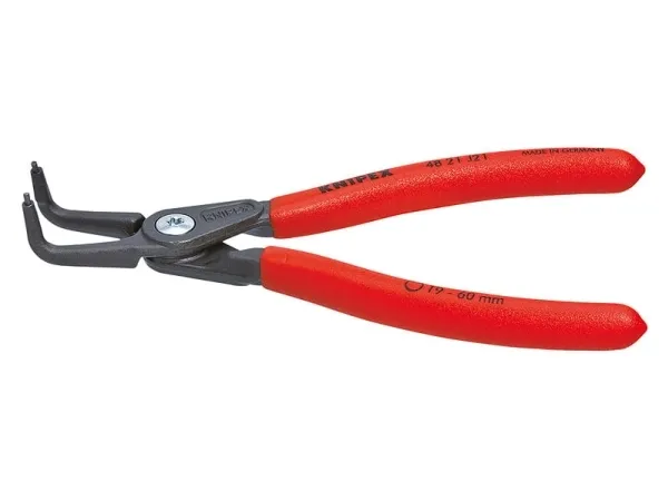 48 21 J21 Præcisions-låseringstang meget belastbar ved konstant brug: op til 10 gange så lang standtid som let drejede spidser. Med indsatte spidser for sikkert arbejde. Store holdeflader på spidserne: ingen vridning af ringene, let montage. Skruet led: tangen går præcist og uden spillerum. Skridsikkert kunststof på grebene. DIN 5256 D; 90° bøjede spidser.