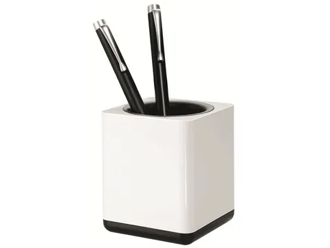 Pennekogger i-line, elegant, moderne, højglans, hvid-sort Pennekogger i-line - et elegant, elegant stykke tilbehør med stor volumen i denne stiftkogger finder hurtigt plads til dine stifter og kontorredskaber og er altid lige ved hånden med praktisk, stiftskånende skumindlæg i høj kvalitet, stabil og kraftig udførelse , der skånsomt gør det særligt møblskånsomt med en overflade, Skridsikre skumbunde . Det højglanspolerede look og den klare linjeføring sætter moderne accenter på ethvert skrivebord i kompromisløs kvalitet for moderne kontorverden , et ægte blikfang design og farve er afstemt efter alle produkter i i i-line-serien Made in Germany materiale: Førsteklasses plast (ABS) udvendige mål (B x D x H): 79 x 79 x 96 mm farve: Hvid-sort