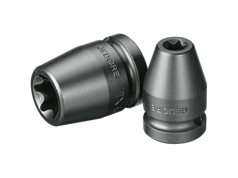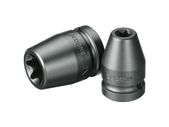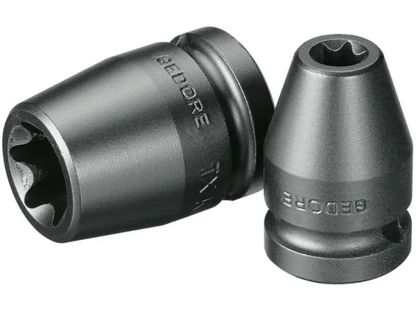 Machine-operated, suitable for all standard electric and air tools. Square drive as per DIN 3121 - G 12.5, ISO 1174. Gedore special steel, gun-metal finish. TORX® = reg. trademark of Acument Intellectual Properties, LLC. USA.