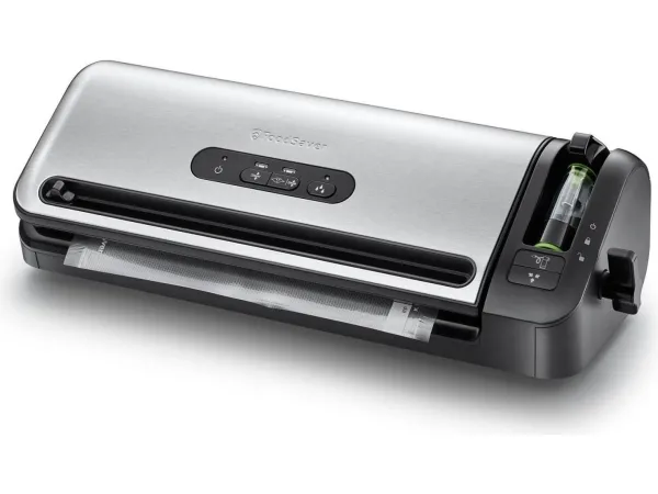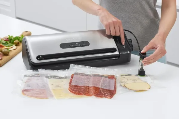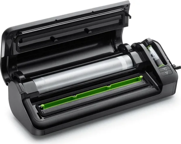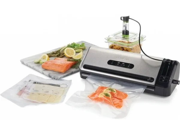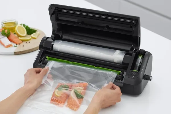 The FoodSaver® FFS017X Food Preservation Vacuum System keeps food fresh for up to five times longer. Its automatic vacuum & seal operation allows you to vacuum seal food in compatible bags and containers. The integrated handheld sealer is perfect for use with FoodSaver® zipper bags and Fresh Containers for short-term storage. Integrated roll storage and cutting facility allows you to cut FoodSaver® rolls and heat seal into bags using the “Seal only” function. There is also a “moist/dry” function for adjusting the seal according to the food consistency and a marinate function. Its stylish design makes the FoodSaver® FFS017X Food Preservation Vacuum System suitable for all kitchens.\n\n- Keep food fresh for up to five times longer with this vacuum sealing system.\n- Sleek, modern design suitable for all sized kitchens.\n- Dishwasher safe removable drip tray.\n- “Seal only”, “Moist/dry” and “Marinate” functions.\n- Integrated handheld vacuum, integrated roll storage & cutting facility, 5 small/large size bags, 3 small Fresh Zipper bags and 1 roll included.\n\nThe FoodSaver® FFS017X Food Preservation Vacuum System is the complete system for all your food storage needs. Use the FoodSaver® bags and rolls to store your food for the long term, in the freezer or the cupboard. Use the bags and rolls as well as Fresh Containers, Zipper Bags and Canisters for short to medium term storage in the cupboard or fridge. Use the Fresh Containers, Zipper Bags and Lunch Boxes for keeping your food fresh on the go and ready to take to work, school or outings.\n\nWith one touch vacuum & seal operation the FoodSaver® FFS017X vacuum sealing system is so simple to use. Simply feed your bag of food into the drip tray inside your FoodSaver® unit and close using the simple lock & latch mechanism.\n\nAt the touch of a button, the machine will automatically remove the air from your bag – progress lights inform you once a vacuum has been created. Once all air is removed, the machine will then heat-seal the bag, locking in freshness.\n\nUse the integrated handheld sealer to vacuum seal FoodSaver® accessories. The integrated roll storage and cutting facility allow you to cut and heat seal FoodSaver® rolls to make bags using the “seal only” function. There is also a moist/dry food setting that allows you to adjust the seal level for different types of food. The dishwasher safe drip tray will collect any excess liquid when you vacuum seal your food. The Marinator mode marinates in minutes, using vacuum power to pulse juices deep into the fibres of the meat.\n\nFoodSaver® bags and rolls are safe to freeze, simmer or microwave defrost only. They are constructed from strong 5-ply material with special channels designed to enable complete removal of air, meaning there is none trapped in ‘pockets’ around the food that can contribute towards freezer burn and compromise freshness. All FoodSaver® bags and rolls are BPA-free – safe for all the family. The FoodSaver® FFS017X Food Preservation Vacuum System includes 5 small/large size bags, 3 small Fresh Zipper bags and 1 roll to get you started.\n\nFoodSaver® is the original consumer vacuum sealing system. As the global market leader, FoodSaver® has sold in excess of 20 million units to date. The FoodSaver® brand continues to innovate in its mission to keep your food fresher for longer.