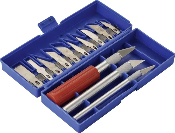 3 forskellige stærke knive · 13 Forskelligt formede superskarpe klinger · Opbevaringsboks med magnet-klingeholder.