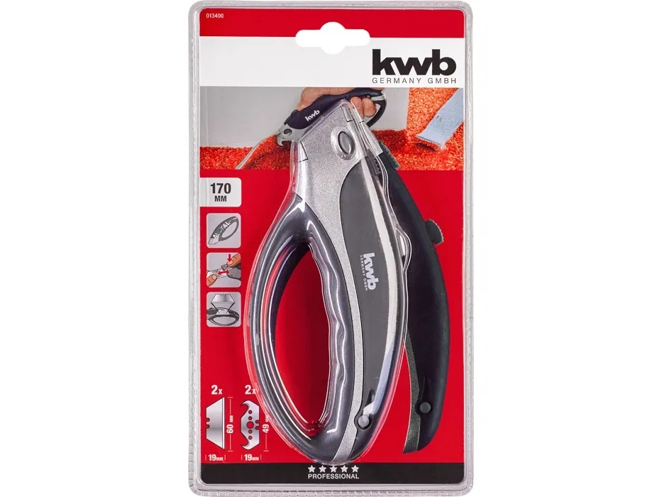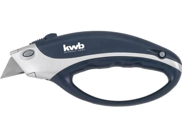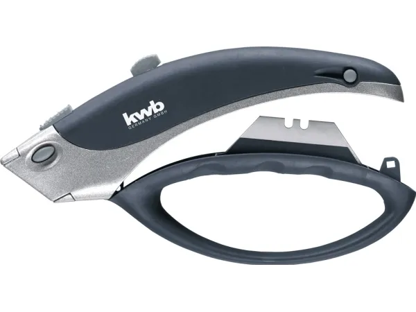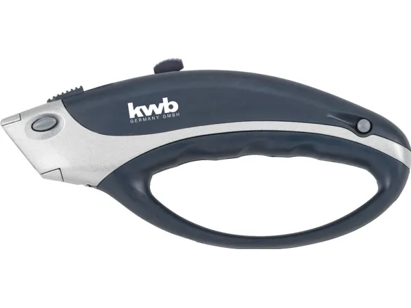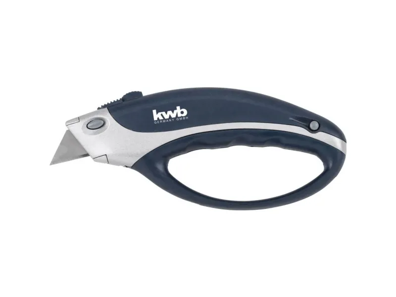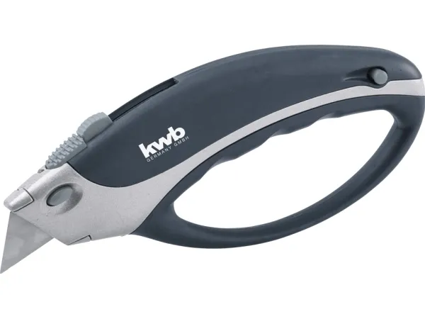 TRAPEZOIDAL CARPET KNIFE WITH CLOSED HANDLE With 1 pc. 49 x 19 mm trapezoid hook blade and 1 trapezoid spare hook blade and 2 trapezoid blades inside the handle, easy withdrawal of the used trapezoid blade by the push of a button, no tools required for exchange of the used blade, special design for cutting of carpets with hook blades, optimal power transmission for carpet cutting with the closed handle, receptacle for trapezoid and hook blades, blade slider with 3 fixing positions for safe working, solid zinc die-cast housing with rubber-coated handles, length 170 mm.