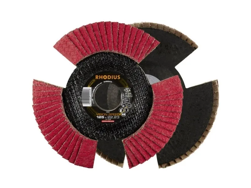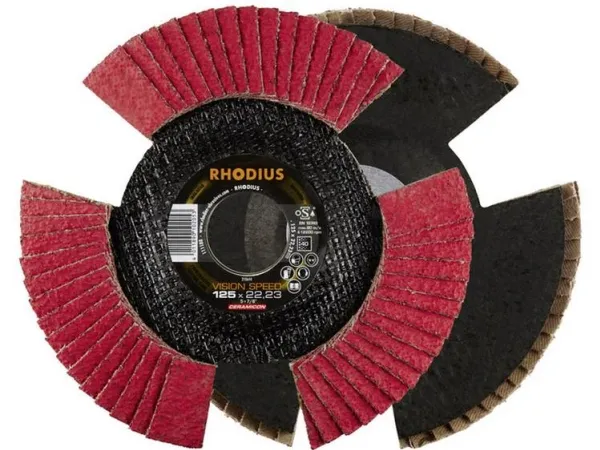 Rhodius VISION SPEED stjernefjederskive 115 x 22,23 - P120 Keramik korn vifteslibeskive. Takket være dens tre huller bliver VISION SPEED ved at dreje transparent. Det giver mulighed for permanent kontrol af det endelige resultat.