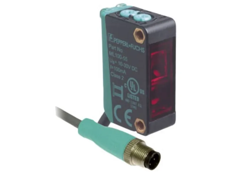 Fotocelle ML100-55/115b/120 Refleksions-fotocelle med polarisationsfilter, plastkabinet, rækkevidde 5 m, rødt lys, sensitivity tallerken, lys/mørk-kobling, DC-version 2 PNP-udgange, fast kabel med stik M12
