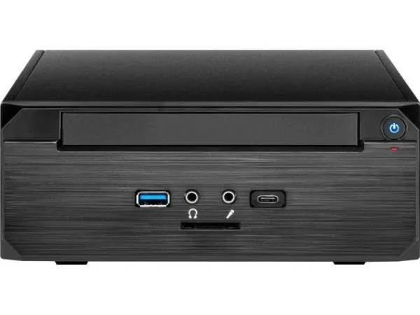 The modern case provides USB 3.0 Type-A, USB 3.0 Type-C, a card reader and audio connectors in the middle of the front as well as a slot for slim DVD in the upper front. The intelligent design of the cases allows a decent thermal relief because both side panels are perforated.