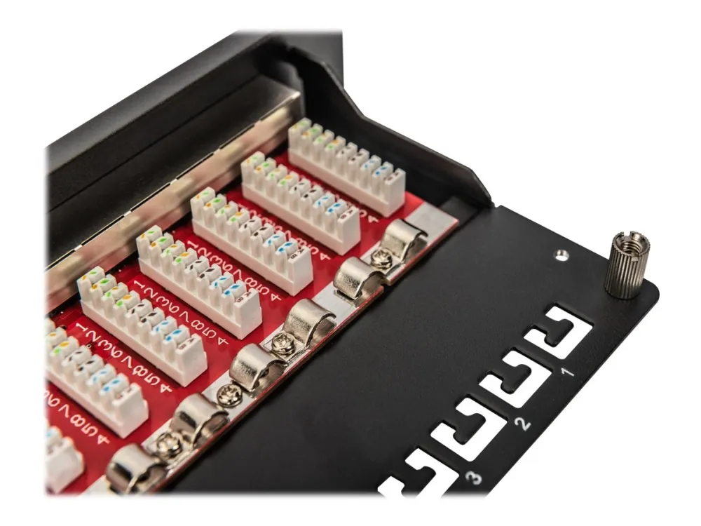 The CAT 6A patch panel offers sturdy design by its 1.5mm galvanic cold rolled steel. Perfect for 10" cabinet mounting. The fully shielded RJ45 sockets provide an optimal stability for your cables with great performances. The patch panel applies to (IEEE 802.3at/af) PoE+ standard. It is shielded electromagnetically and offers lost and interruption free forwarding of your data in your network. The 360 degree shielding at the contact points makes sure every single point of consolidation is shielded perfectly.