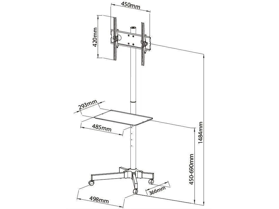 - 23"- 55" LED/TV/LCD Support (supported VESA standard: up to 400 x 400) - Supports TVs up to 25 kg - Robust bracket for height adjustable AV components - Adjustable height-adjustable TV bracket from -15° to 15° - Solid base with wheels equipped with brake for maximum stability - Robust, low-profile rear feet allow the positioning of the support even very close to the wall - Integrated cabling management system - Basic dimensions: 49.8x36.6 cm; TV bracket: 45x42 cm - Shelf dimensions: 48.5x29.3 cm; Max height: 150cm - Black Colour