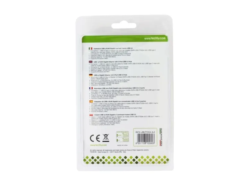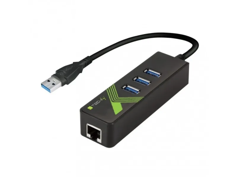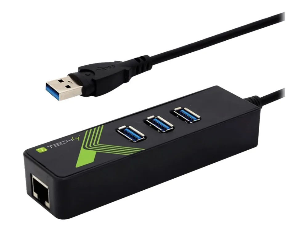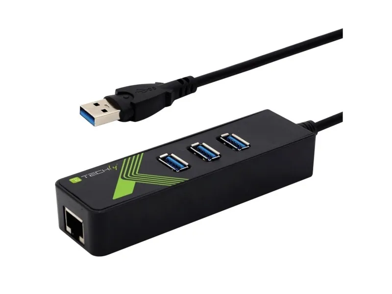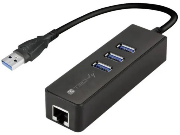 - Allows you to add a Gigabit network connection to a notebook via a USB3.0 port and provides 3 USB 3.0 ports to connect additional peripherals\n- Three ports Hub USB3.0 SuperSpeed with transfer rate up to 5 Gbps\n- A Gigabit Ethernet (RJ45) port supports full-duplex transfer\n- Replaces an internal malfunctioning internal Gigabit Ethernet RJ45 port on a laptop and provides additional USB 3.0 ports for USB peripherals\n- Connections: 1x USB 3.0 type A male on the cable, 3 x USB 3.0 type A female, 1 x RJ45\n- Compatible with Windows, Linux and Mac\n- Cable length: 14 cm\n- Color: black